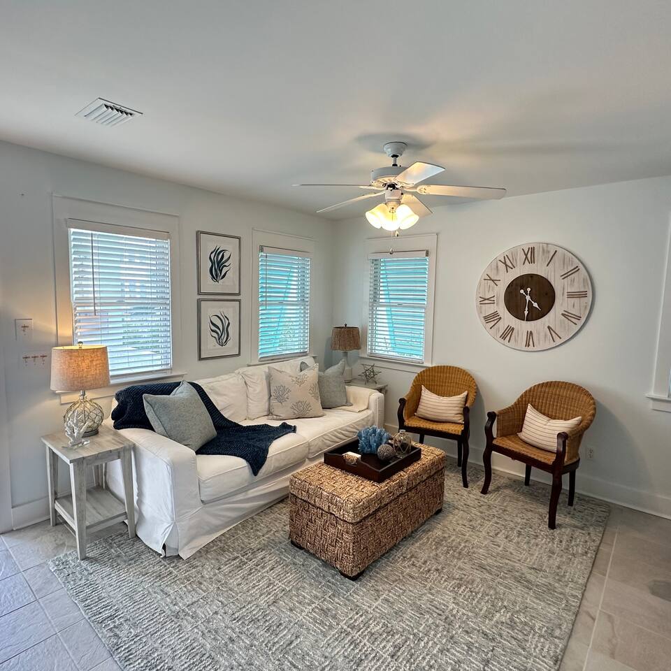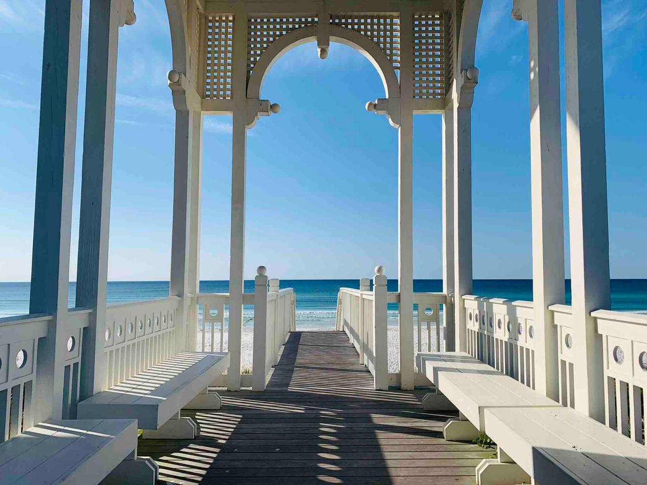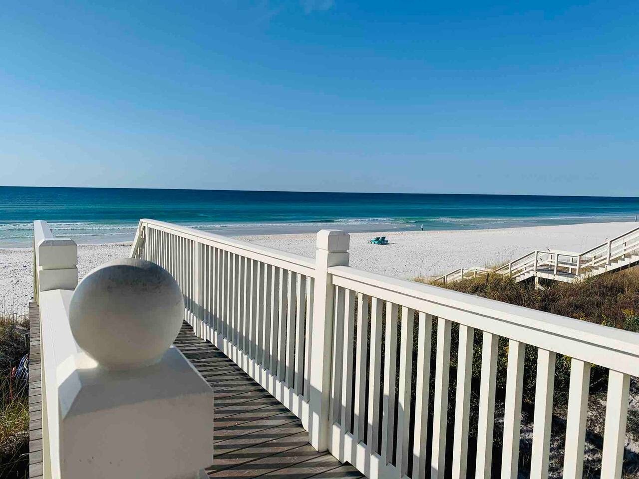 Our beach cottage is located just 30 steps from beach walk over #1 in the gated community of Carillon Beach. Our cozy two story, two bedroom cottage is only steps away from some of the most beautiful beaches in the world. Located on a large lot with lush greens. This cottage features an open living concept, with two bedrooms. Each bedroom has its own bathroom with walk in shower. There is a TV in each bedroom and a walk out balcony off the master. Enjoy the morning light on the gazebo.