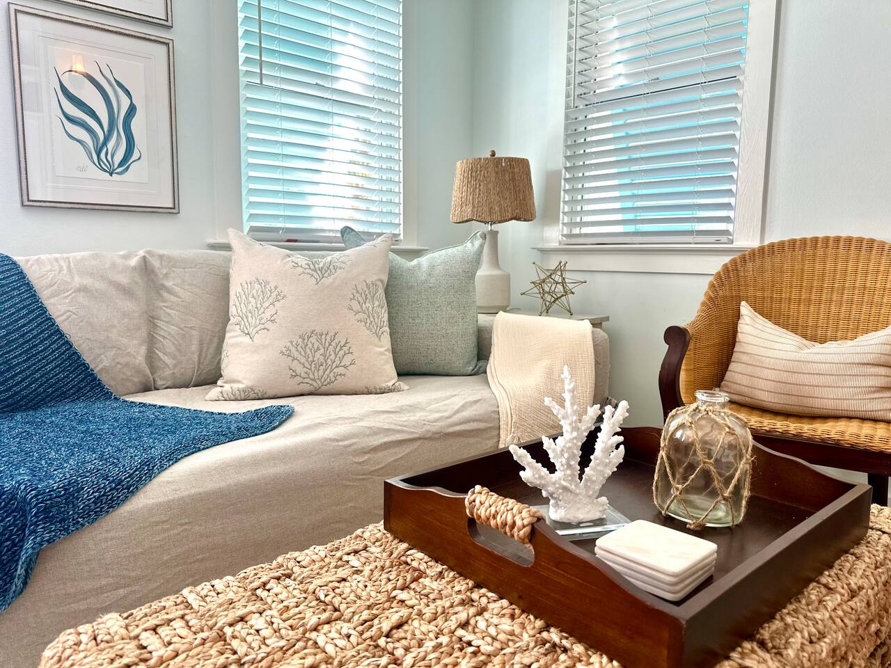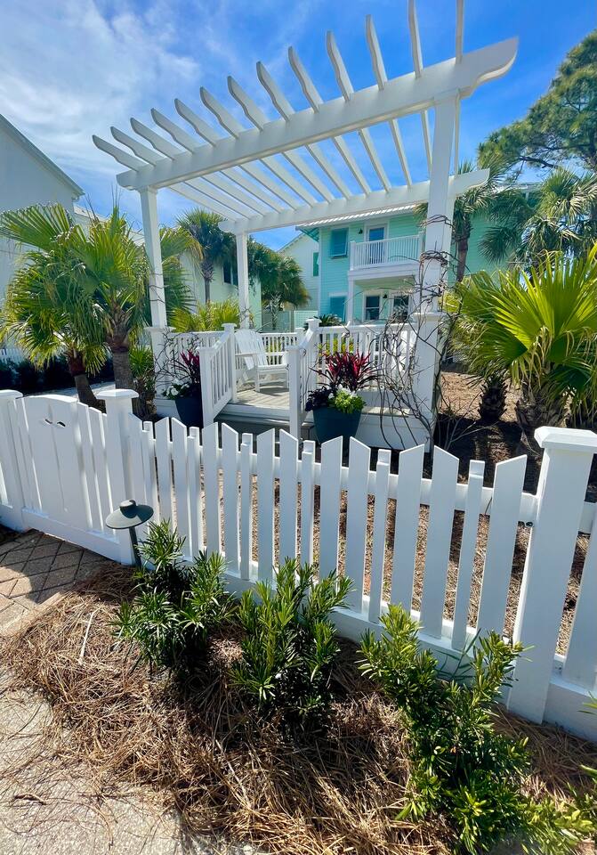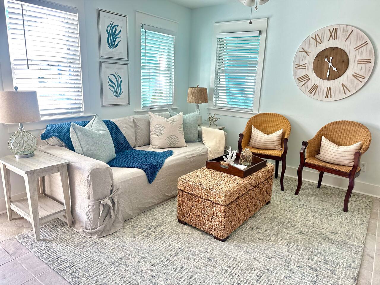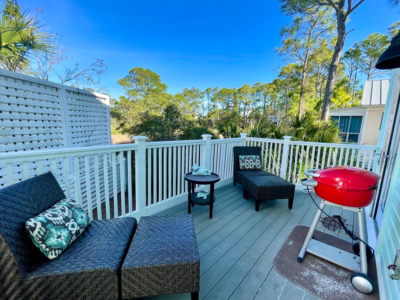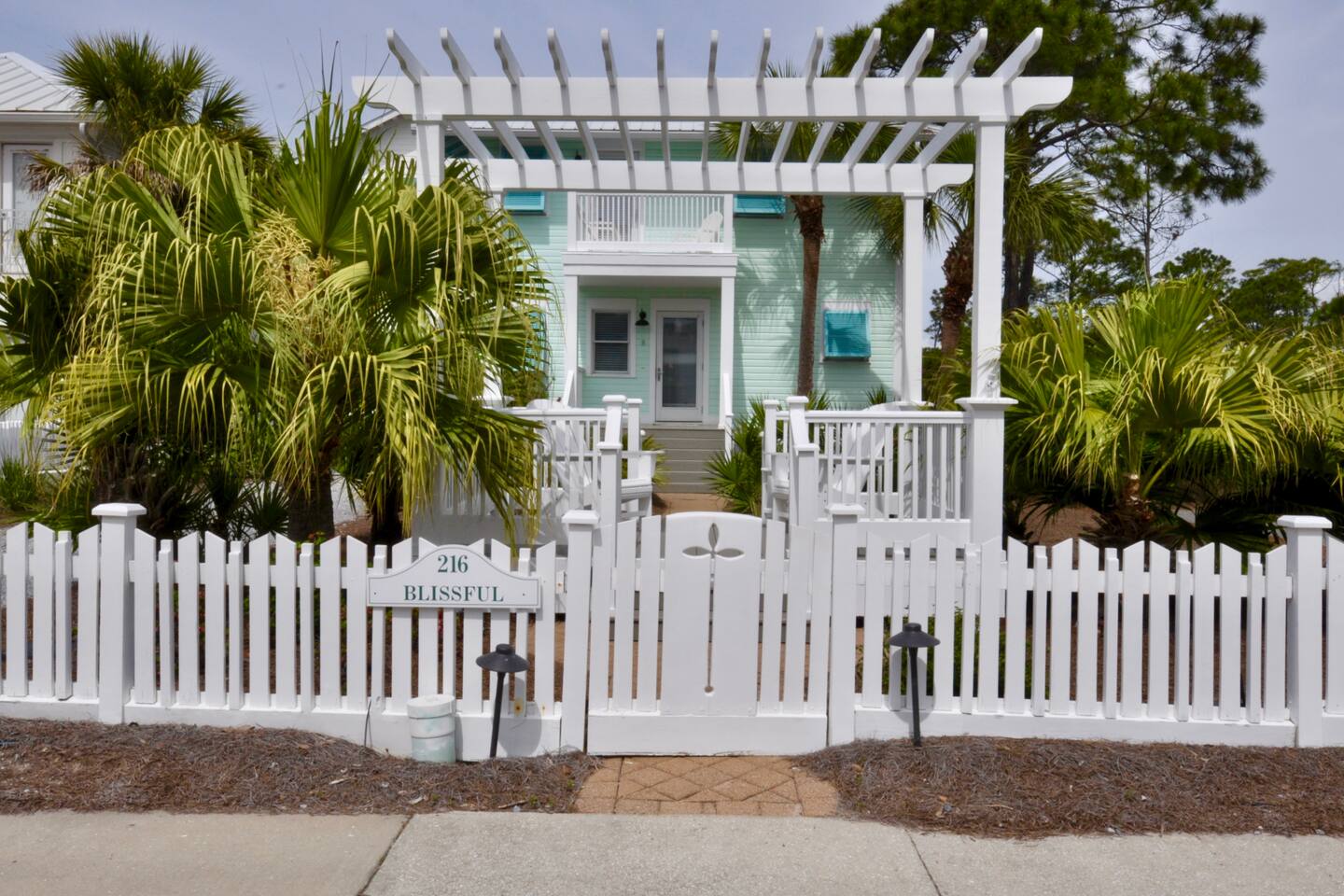 Blissful beach cottage is located just 30 steps from beach walk over #1 in the gated community of Carillon Beach. The emerald coast is known for its pristine white sand beaches and gorgeous emerald waters. Our cozy two story, two bedroom cottage is only steps away from some of the most beautiful beaches in the world. Located on a large lot with lush greens, and a gazebo for relaxing and sipping on your morning coffee or evening cocktail. This cottage features an open living dining kitchen concept, with two bedrooms upstairs. Each bedroom has its own bathroom with walk in shower. There is one bedroom with a king bed and flat screen TV, and a second bedroom with a queen bed and flat screen TV. Upstairs you will find a walk out balcony off the master bedroom. Cooking supplies are fully stocked in a spaciously clean kitchen. Dining for six offers plenty of room to have company over for entertaining. Lots of windows bring in the welcoming coastal light. Enjoy a large flat screen TV with cable in our inviting living room. Off the back of the property is a new patio with lounging chairs and views of the lush green surrounding vegetation. The sunsets from our quaint beach community are strikingly unforgettable. From morning to night you will enjoy the relaxing vibe this beach paradise. Two wood beach lounging chairs with pads and umbrella are included in your stay. Pack the cooler and head straight to the beach for fun in the sun. When you need a nap, a one minute stroll will lead you back home where you can simply unwind and enjoy the comforts of our home. With lots of attention to detail, we trust that our home will welcome you and your guests for a memorable beach vacation.