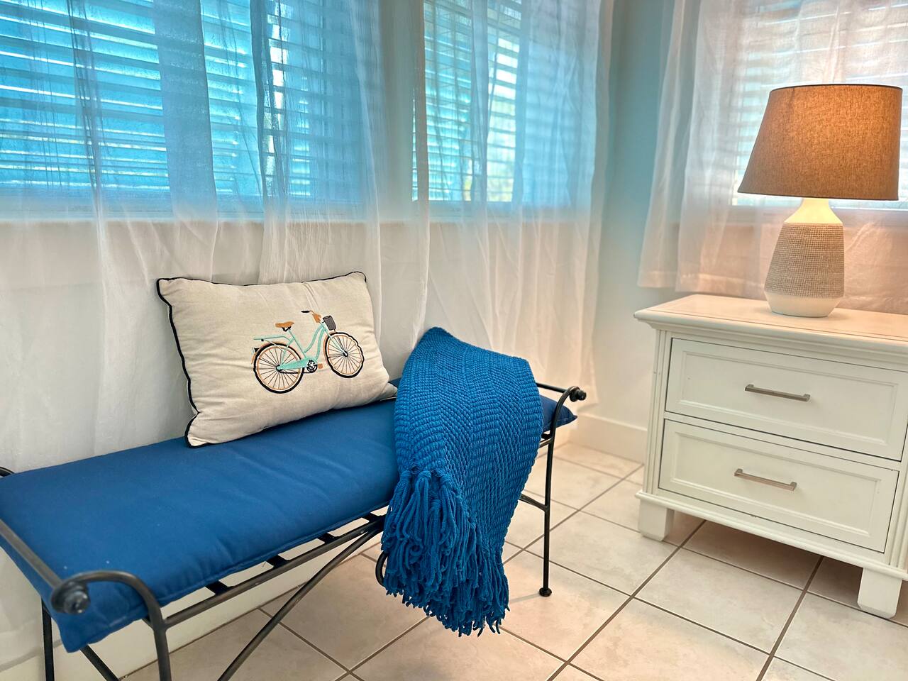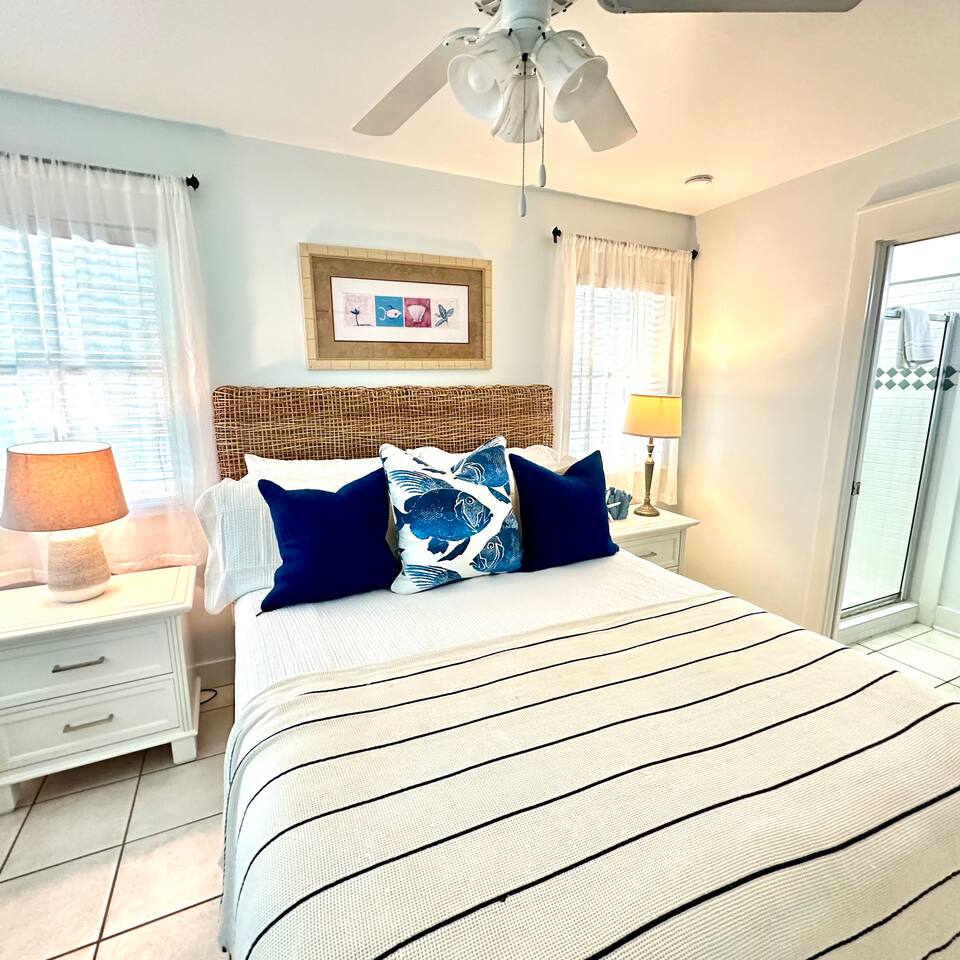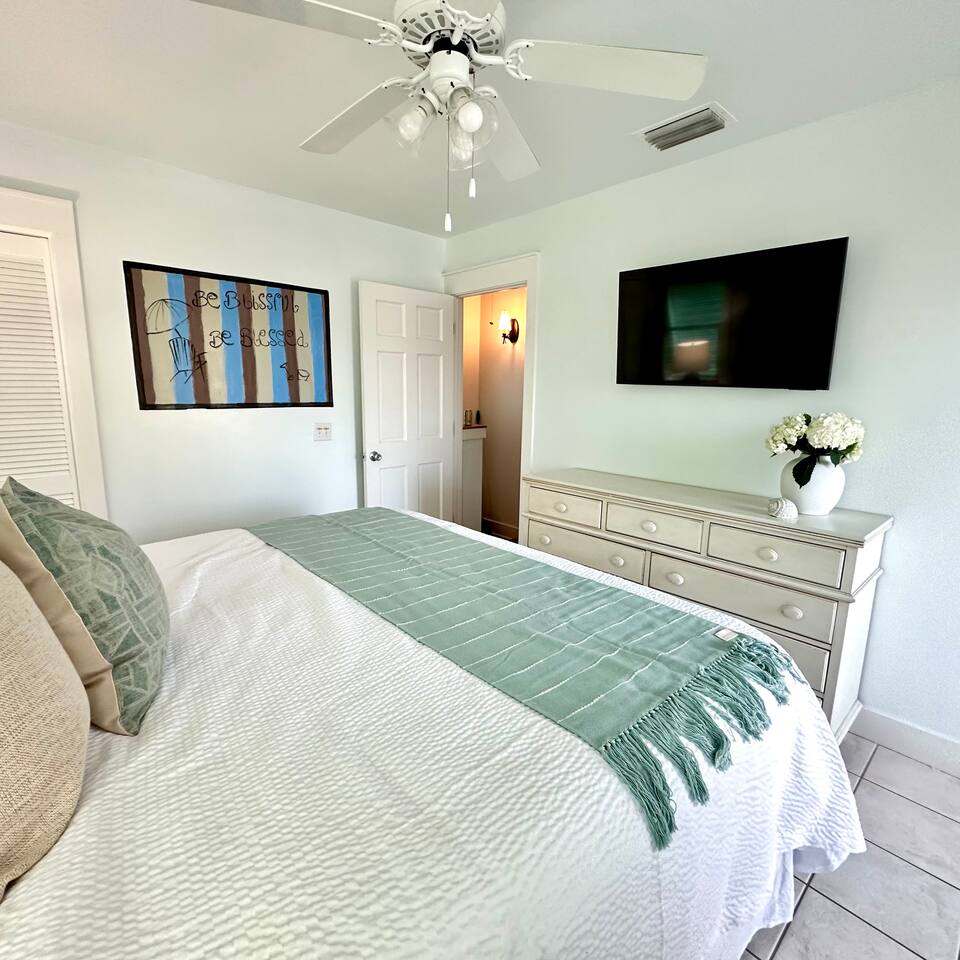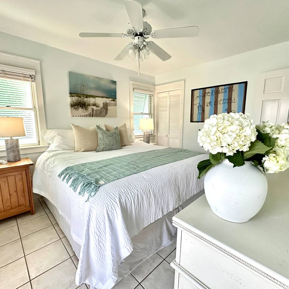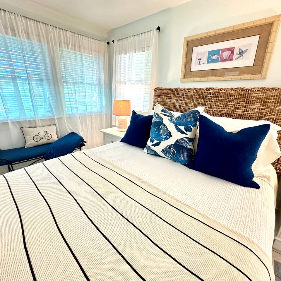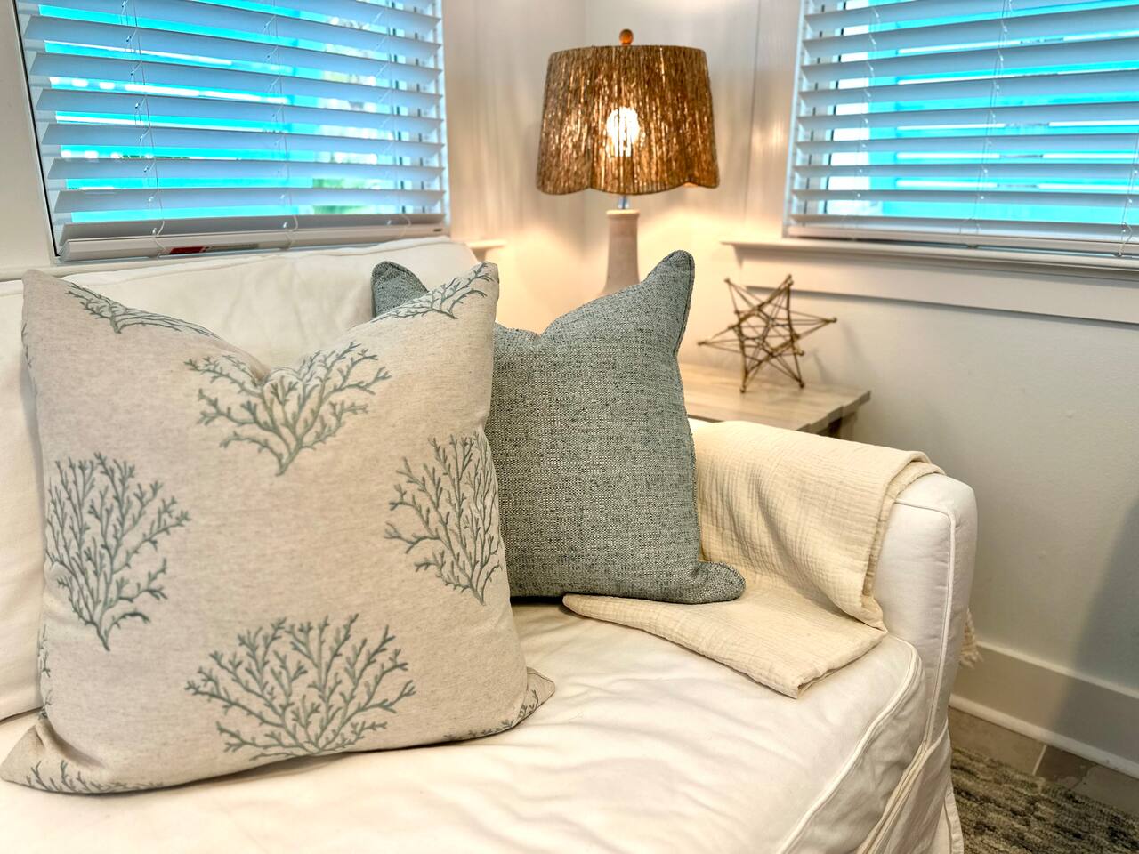 Blissful beach cottage is located just 30 steps from beach walk over #1 in the gated community of Carillon Beach. The emerald coast is known for its pristine white sand beaches and gorgeous emerald waters. Our cozy two story, two bedroom cottage is only steps away from some of the most beautiful beaches in the world. Located on a large lot with lush greens, and a gazebo for relaxing and sipping on your morning coffee or evening cocktail. This cottage features an open living dining kitchen concept, with two bedrooms upstairs. Each bedroom has its own bathroom with walk in shower. There is one bedroom with a king bed and flat screen TV, and a second bedroom with a queen bed and flat screen TV. Upstairs you will find a walk out balcony off the master bedroom. Cooking supplies are fully stocked in a spaciously clean kitchen. Dining for six offers plenty of room to have company over for entertaining. Lots of windows bring in the welcoming coastal light. Enjoy a large flat screen TV with cable in our inviting living room. Off the back of the property is a new patio with lounging chairs and views of the lush green surrounding vegetation. The sunsets from our quaint beach community are strikingly unforgettable. From morning to night you will enjoy the relaxing vibe this beach paradise. Two wood beach lounging chairs with pads and umbrella are included in your stay. Pack the cooler and head straight to the beach for fun in the sun. When you need a nap, a one minute stroll will lead you back home where you can simply unwind and enjoy the comforts of our home. With lots of attention to detail, we trust that our home will welcome you and your guests for a memorable beach vacation.