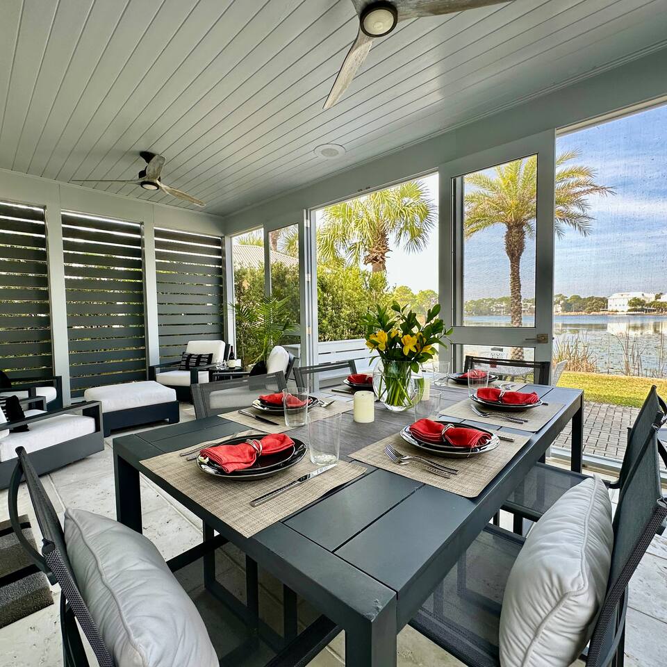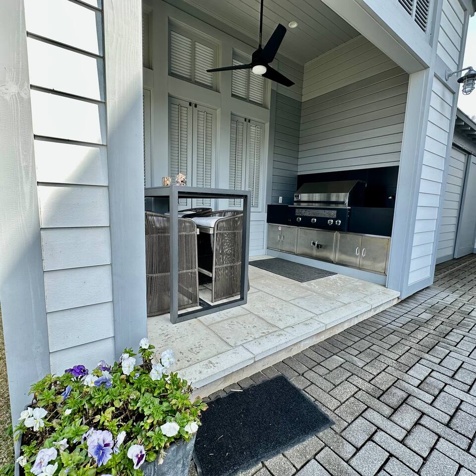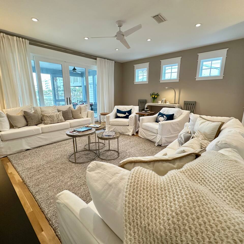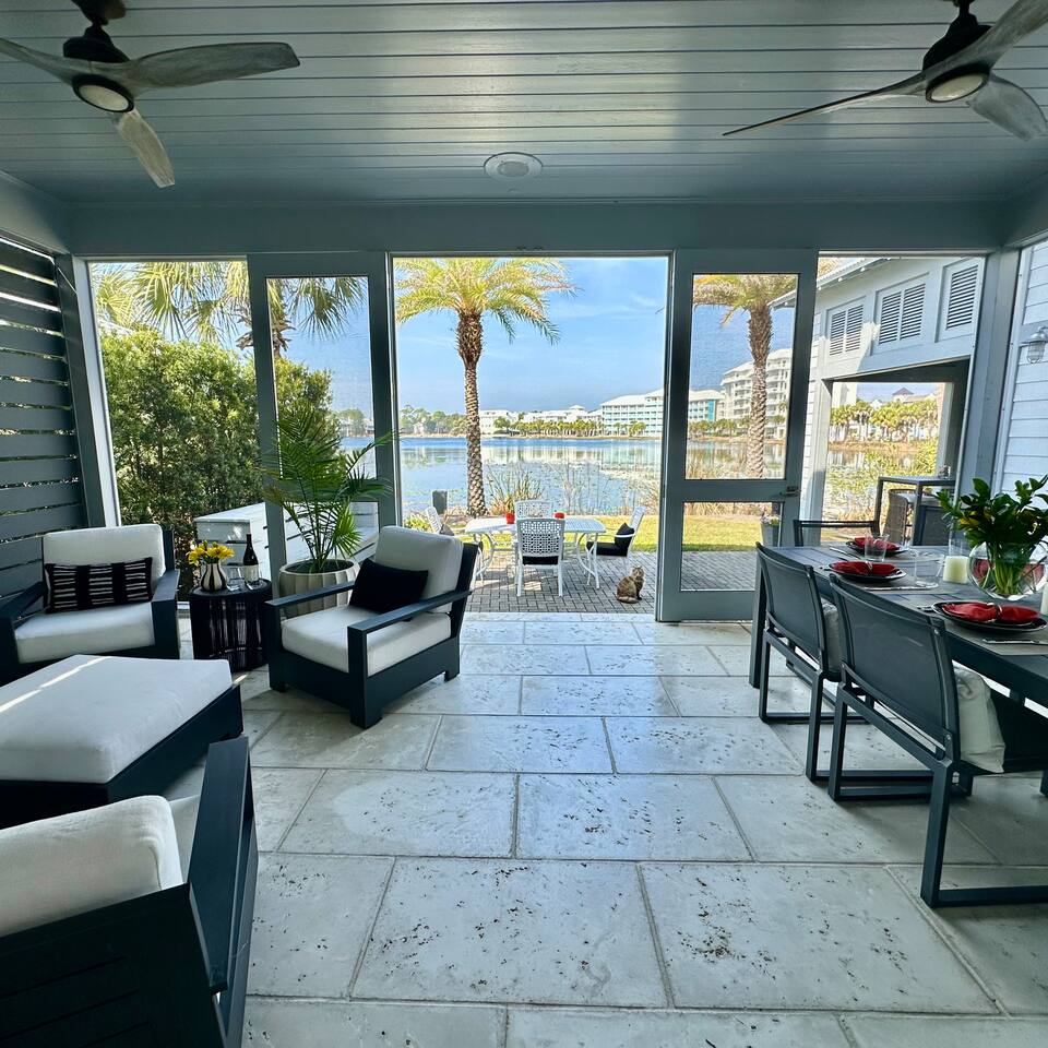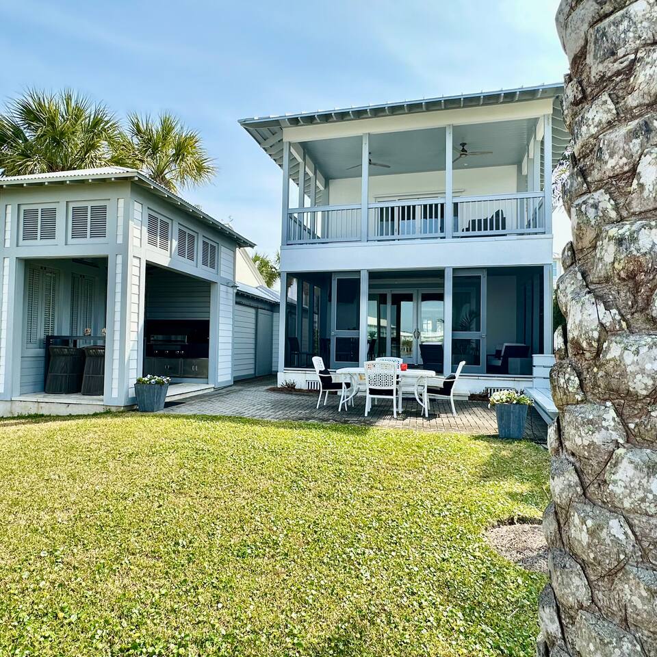 Wake to lake views and fall asleep to ocean breezes at Neither Tide Nor Time. This elegant beach home features 3 bedrooms, 4 bathrooms, a private office, covered patios, lakeside outdoor dining, a built-in grill, and a crow’s nest with stunning sea views. Just steps from the sand, enjoy Restoration Hardware linens, Molton Brown amenities, and a calm, thoughtfully designed space for a peaceful, luxurious escape. Centrally located for effortless coastal living.