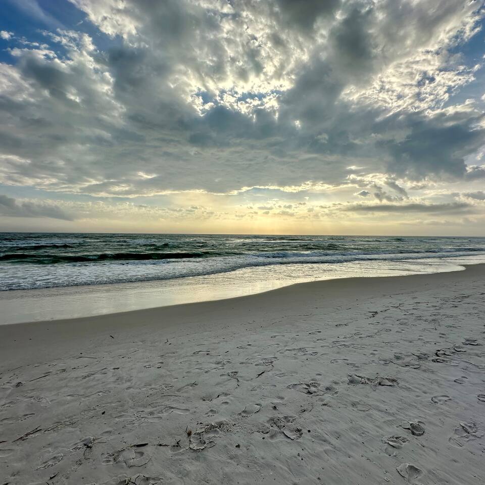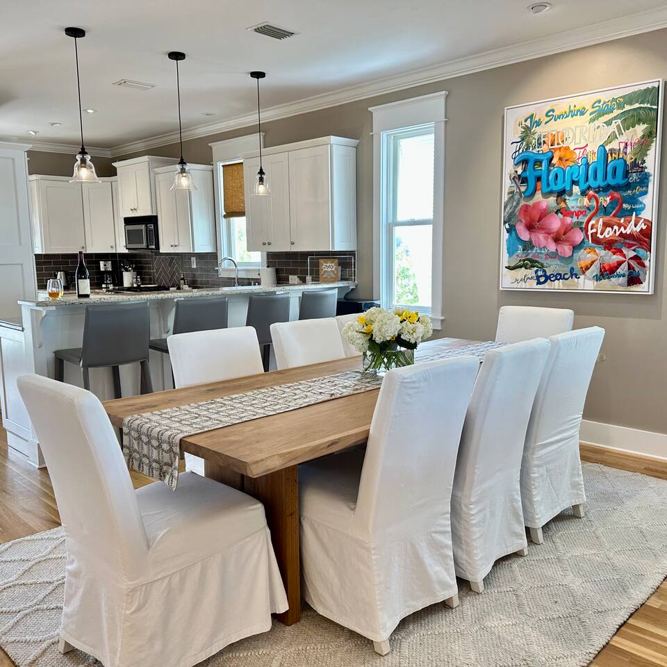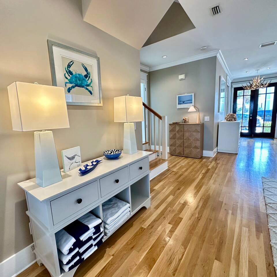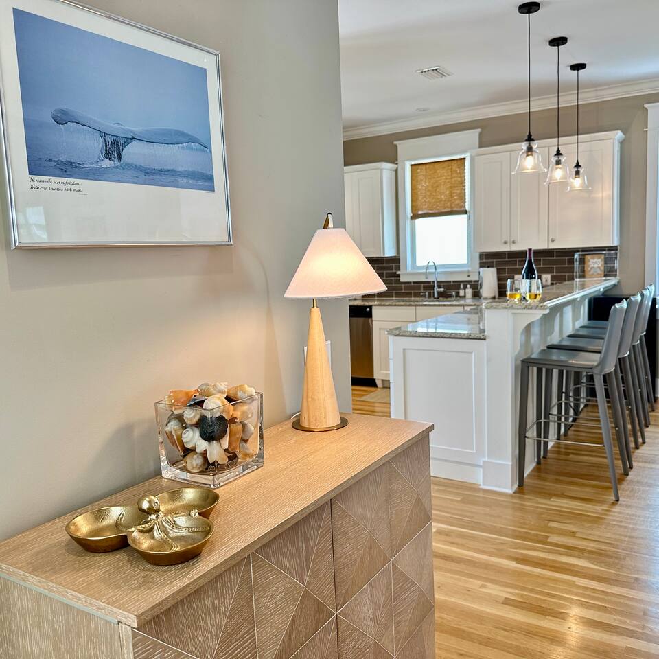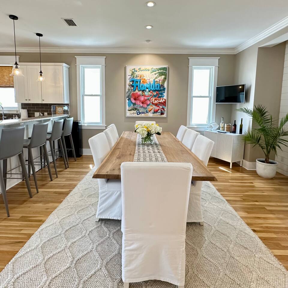 The Space Neither Tide Nor Time is a quiet, beautifully designed beach retreat created for comfort, connection, and relaxation. The open-concept living area features comfortable seating and a welcoming flow into the dining space, which accommodates up to 8 guests. The fully stocked kitchen makes cooking easy, whether you’re preparing a quick breakfast or a family dinner. A washer and dryer are available for guest convenience. The primary suite offers a king bed and a spacious en suite bathroom with double sinks and a walk-in shower. The second bedroom features a queen bed and a private bathroom with a tub/shower combination. The third bedroom includes its own private bathroom with a walk-in shower. Each bedroom, as well as the living room, is equipped with a TV. Downstairs, you’ll find a quiet office space perfect for remote work, along with an additional full bathroom with a walk-in shower. Outdoor living is just as inviting. Enjoy the screened-in porch with a dining table and comfortable seating, rinse off in the outdoor shower, or take advantage of the outdoor bathroom after a beach day. A built-in grill and open lawn facing the lake create the perfect setting for relaxed evenings and outdoor meals. Good to Know Dining space for up to 8 guests Fully stocked kitchen Washer & dryer in home TVs in all bedrooms and living room Screened-in porch with dining and seating Outdoor shower and outdoor bathroom Built-in grill and lakeside lawn Quiet, peaceful setting—ideal for rest and relaxation This is a dream home away from home, thoughtfully designed for a calm, comfortable, and truly memorable beach getaway.