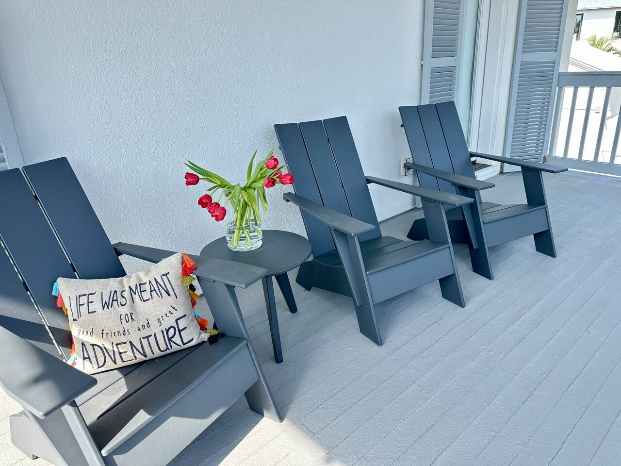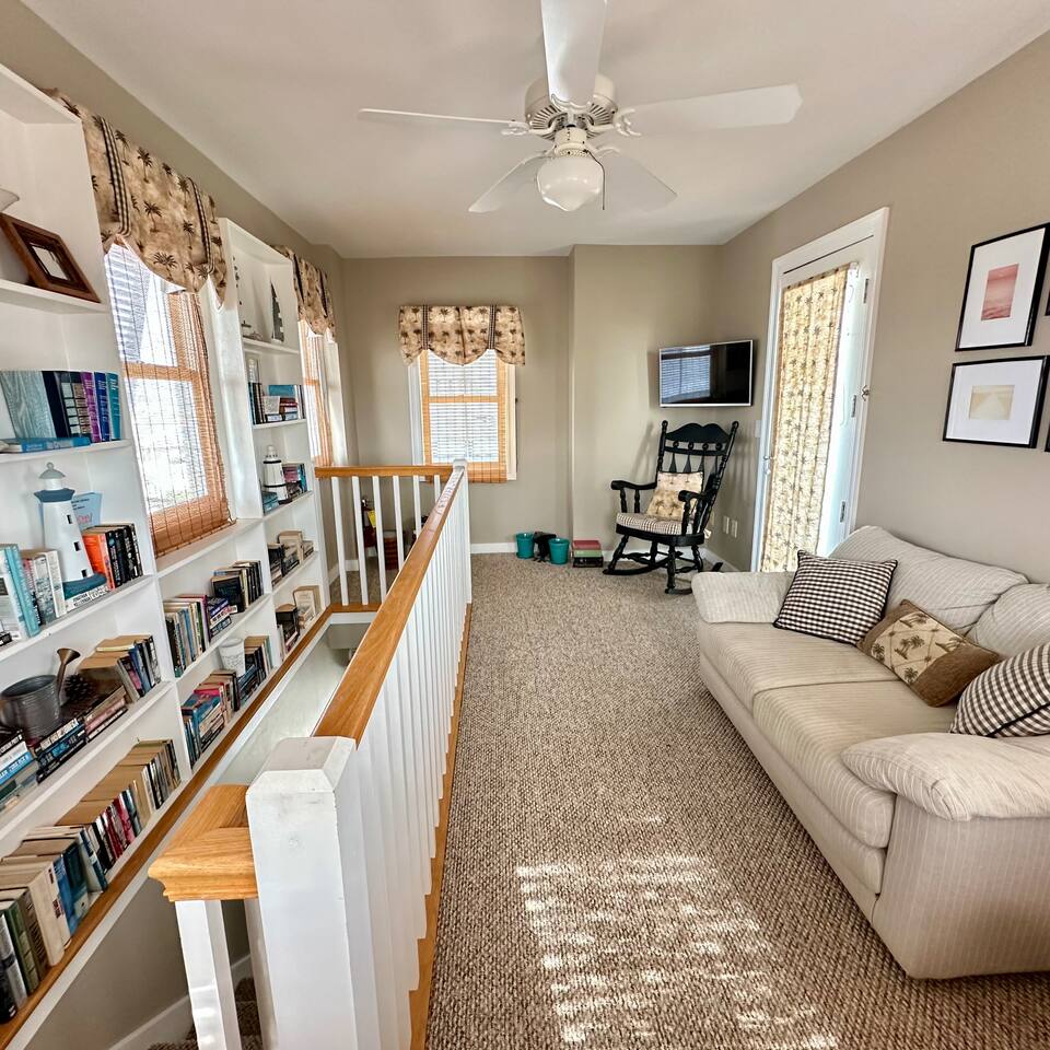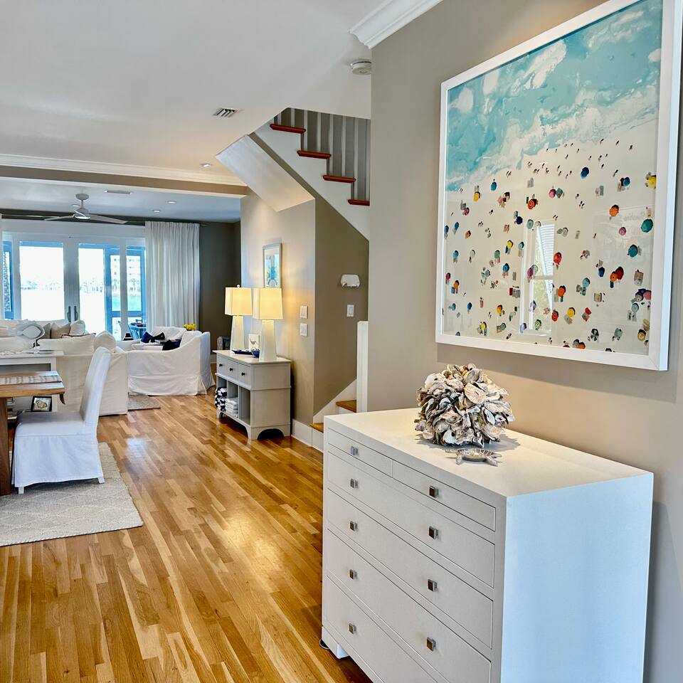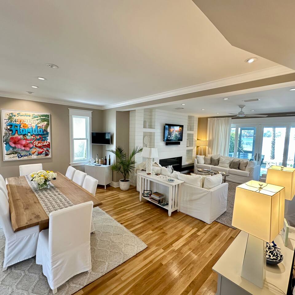 The Space Neither Tide Nor Time is a quiet, beautifully designed beach retreat created for comfort, connection, and relaxation. The open-concept living area features comfortable seating and a welcoming flow into the dining space, which accommodates up to 8 guests. The fully stocked kitchen makes cooking easy, whether you’re preparing a quick breakfast or a family dinner. A washer and dryer are available for guest convenience. The primary suite offers a king bed and a spacious en suite bathroom with double sinks and a walk-in shower. The second bedroom features a queen bed and a private bathroom with a tub/shower combination. The third bedroom includes its own private bathroom with a walk-in shower. Each bedroom, as well as the living room, is equipped with a TV. Downstairs, you’ll find a quiet office space perfect for remote work, along with an additional full bathroom with a walk-in shower. Outdoor living is just as inviting. Enjoy the screened-in porch with a dining table and comfortable seating, rinse off in the outdoor shower, or take advantage of the outdoor bathroom after a beach day. A built-in grill and open lawn facing the lake create the perfect setting for relaxed evenings and outdoor meals. Good to Know Dining space for up to 8 guests Fully stocked kitchen Washer & dryer in home TVs in all bedrooms and living room Screened-in porch with dining and seating Outdoor shower and outdoor bathroom Built-in grill and lakeside lawn Quiet, peaceful setting—ideal for rest and relaxation This is a dream home away from home, thoughtfully designed for a calm, comfortable, and truly memorable beach getaway.