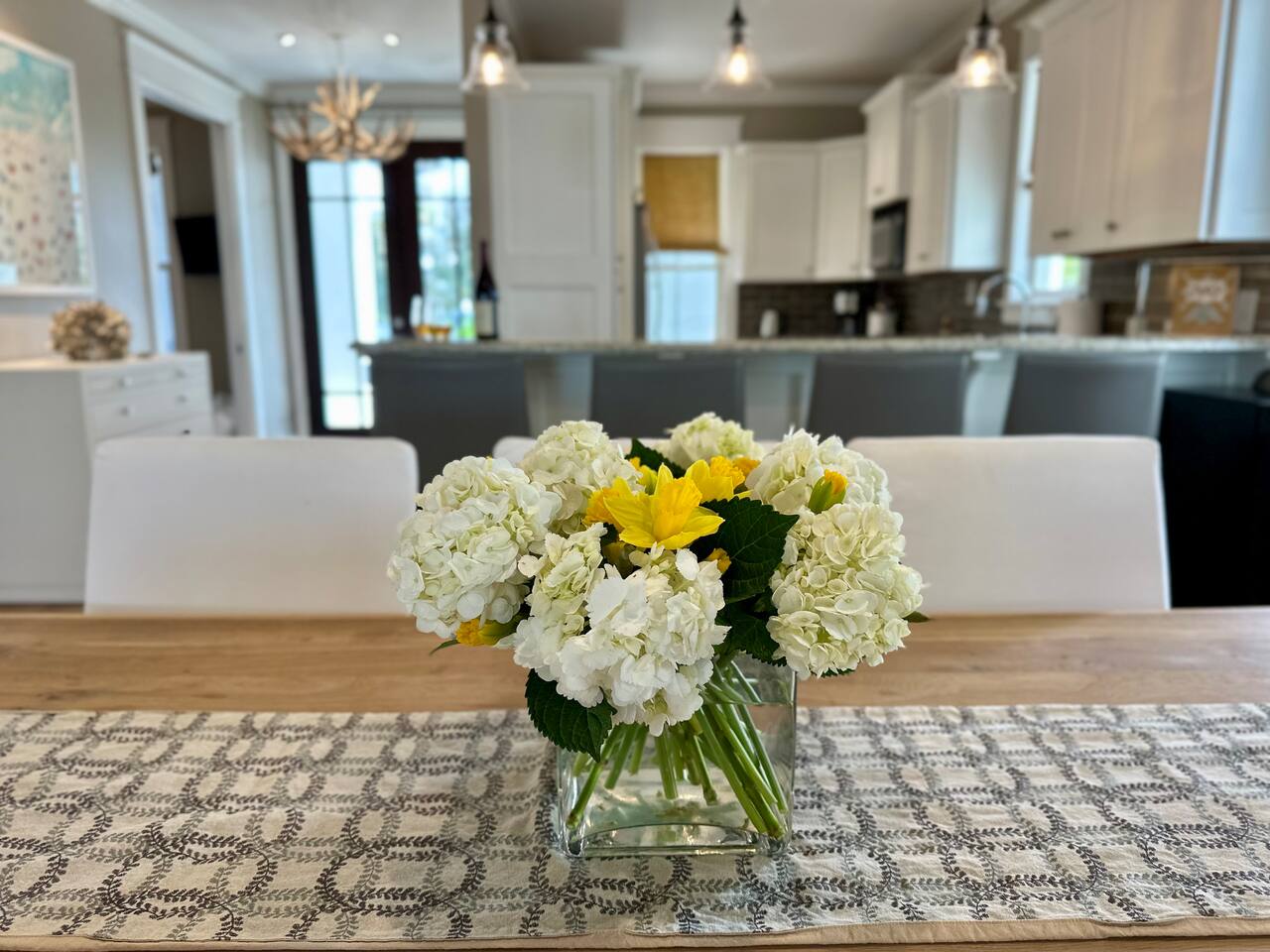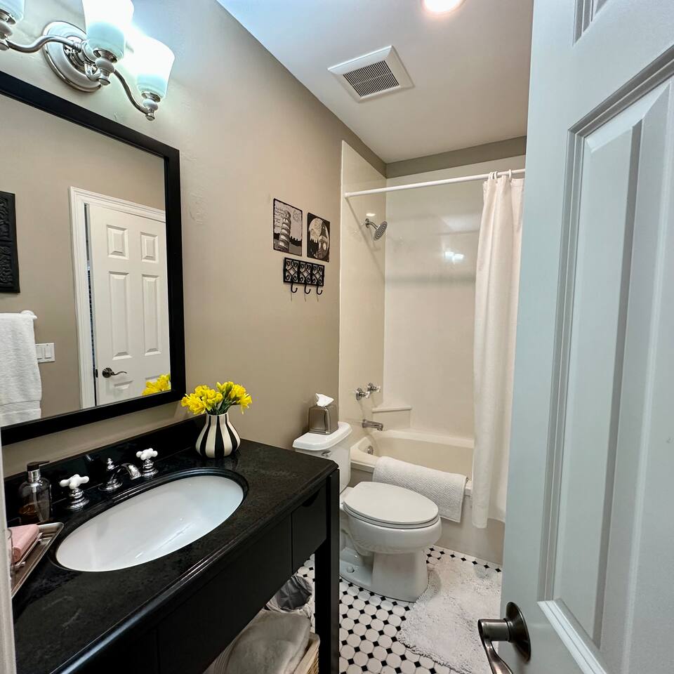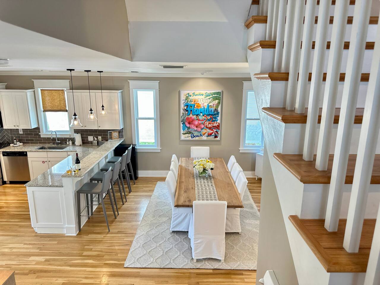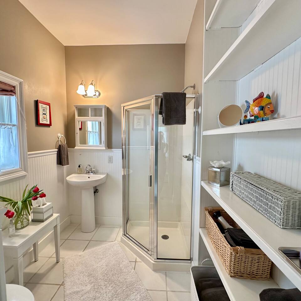 The Space Neither Tide Nor Time is a quiet, beautifully designed beach retreat created for comfort, connection, and relaxation. The open-concept living area features comfortable seating and a welcoming flow into the dining space, which accommodates up to 8 guests. The fully stocked kitchen makes cooking easy, whether you’re preparing a quick breakfast or a family dinner. A washer and dryer are available for guest convenience. The primary suite offers a king bed and a spacious en suite bathroom with double sinks and a walk-in shower. The second bedroom features a queen bed and a private bathroom with a tub/shower combination. The third bedroom includes its own private bathroom with a walk-in shower. Each bedroom, as well as the living room, is equipped with a TV. Downstairs, you’ll find a quiet office space perfect for remote work, along with an additional full bathroom with a walk-in shower. Outdoor living is just as inviting. Enjoy the screened-in porch with a dining table and comfortable seating, rinse off in the outdoor shower, or take advantage of the outdoor bathroom after a beach day. A built-in grill and open lawn facing the lake create the perfect setting for relaxed evenings and outdoor meals. Good to Know Dining space for up to 8 guests Fully stocked kitchen Washer & dryer in home TVs in all bedrooms and living room Screened-in porch with dining and seating Outdoor shower and outdoor bathroom Built-in grill and lakeside lawn Quiet, peaceful setting—ideal for rest and relaxation This is a dream home away from home, thoughtfully designed for a calm, comfortable, and truly memorable beach getaway.
